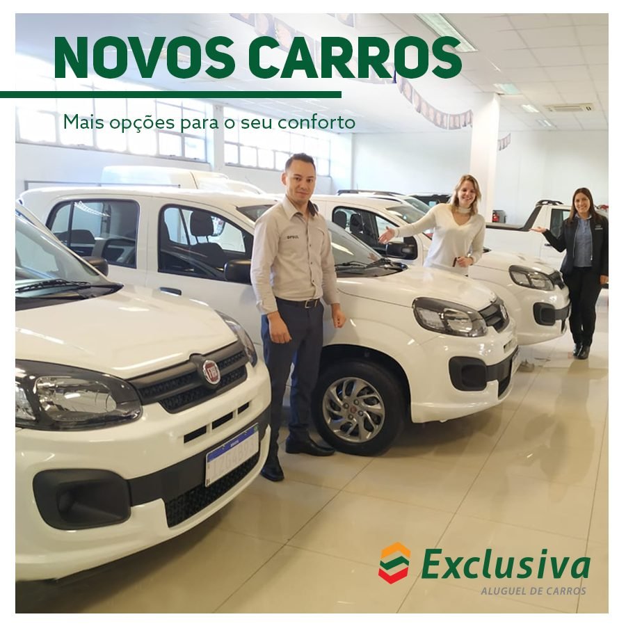 Sempre prezando pela segurança e conforto de seus clientes, a locadora mantém uma frota de excelentes veículos, revisados e impecáveis, como Spin – que comporta até sete pessoas – Utilitários: Saveiro, Montana, Fiorino; – Sedans/Automáticos: Grand Siena, Prisma, Voyage e diversos modelos da categoria 1.0. A EXCLUSIVA atende empresas, turistas e demais pessoas que buscam qualidade e responsabilidade na locação de veículos.